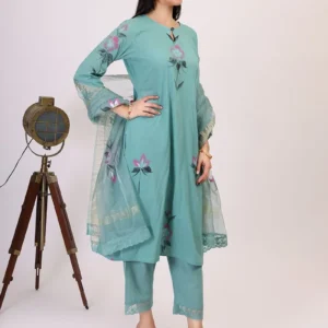 Women Peach Aari Embroidered Chanderi Kurta with Pants