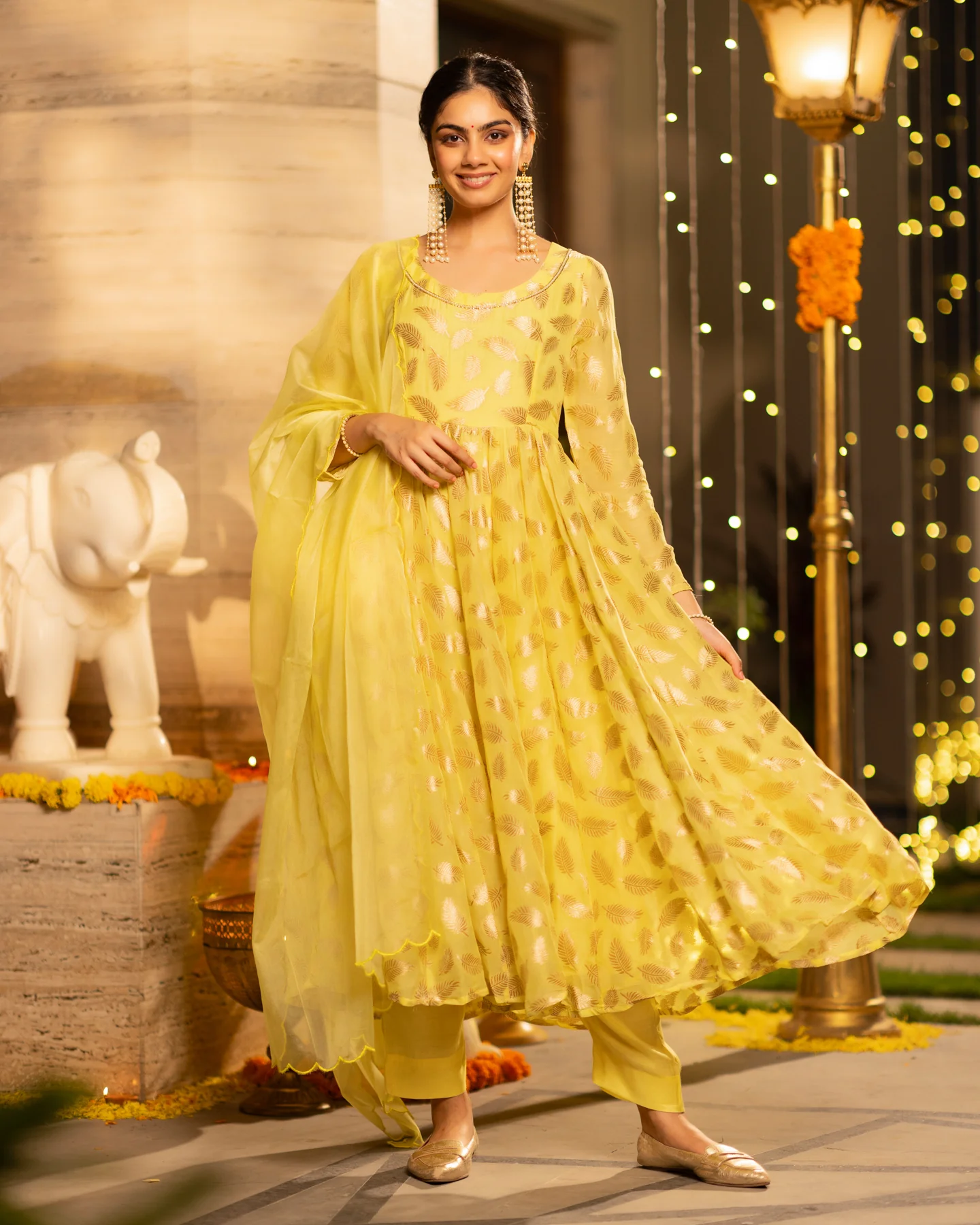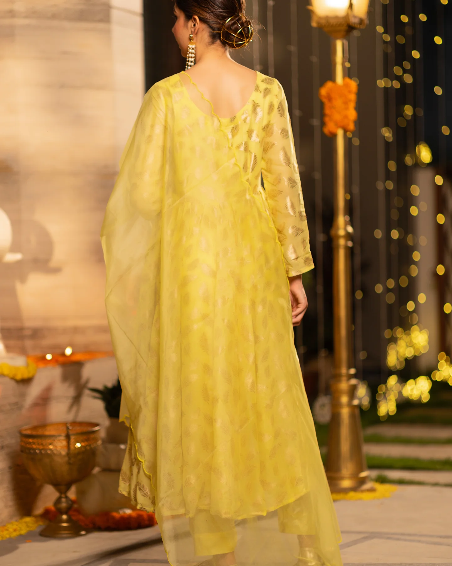 Anarkali Suit: A long, flared tunic that usually fits snugly on the bust and flares out from the waist down to the ankles or floor. In “radiant yellow,” it would be a bright, vibrant yellow shade, often ideal for festive or daytime occasions.