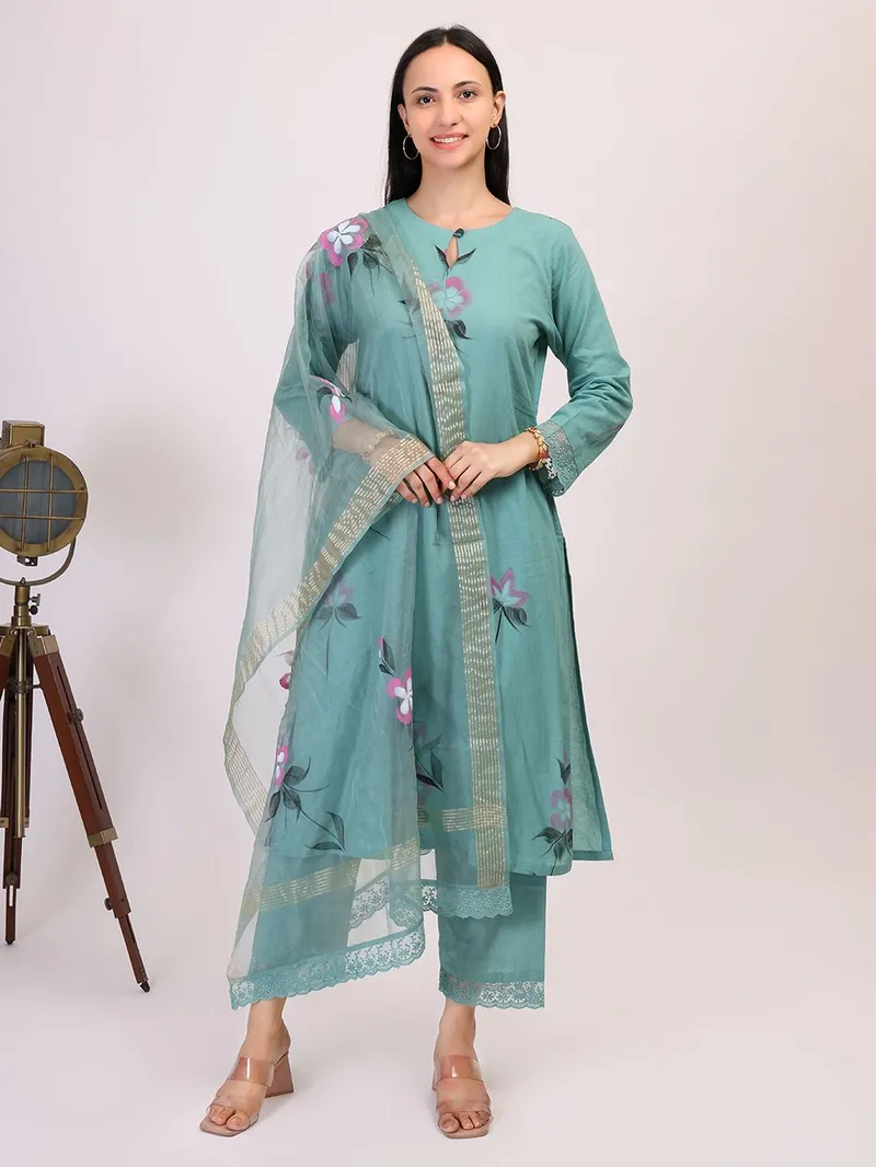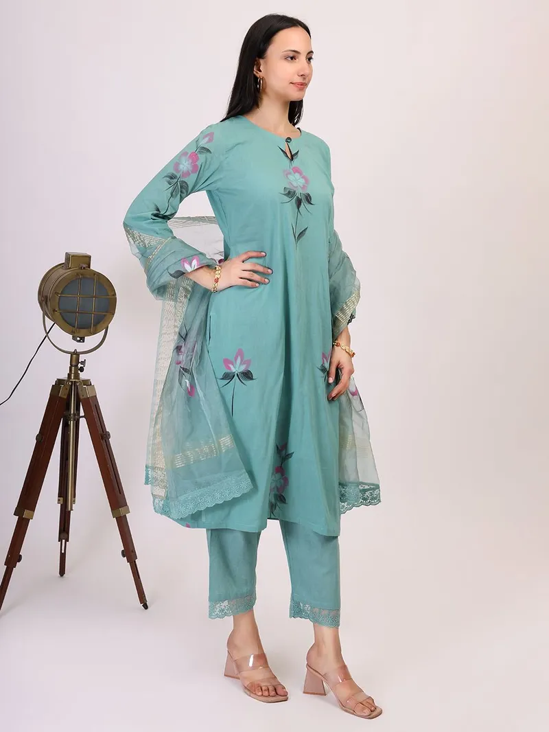 Turquoise Hand Painted Cotton Suit – Set of 3