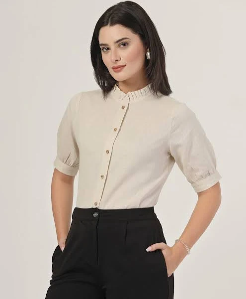 This solid beige shirt is incredibly versatile, making it easy to mix and match with other wardrobe staples. It pairs effortlessly with jeans, skirts, or trousers, allowing you to create both casual and office-ready looks. You can also layer it with sweaters, blazers, or cardigans for a more sophisticated appearance or tie it at the waist for a more relaxed, trendy vibe.